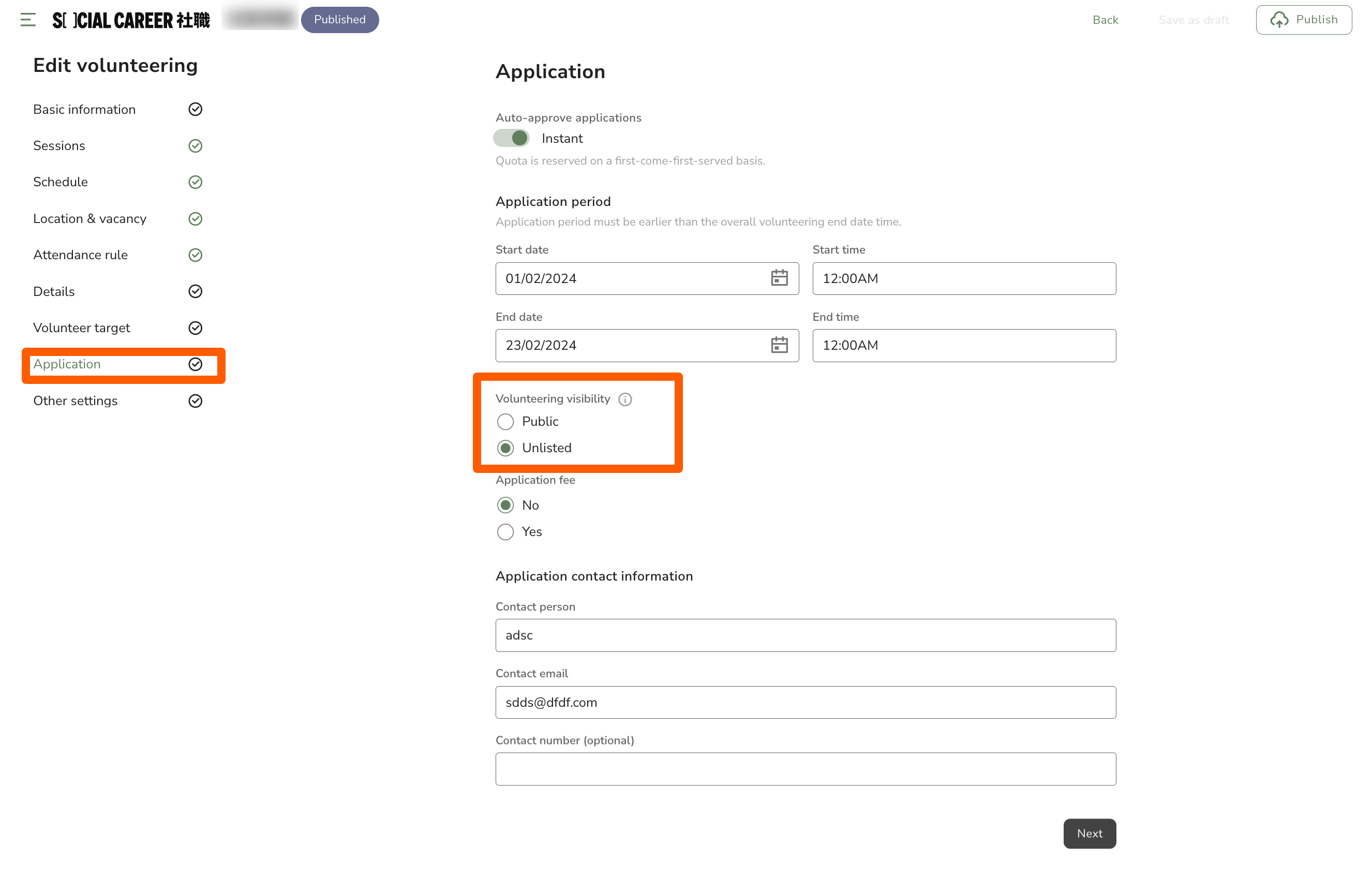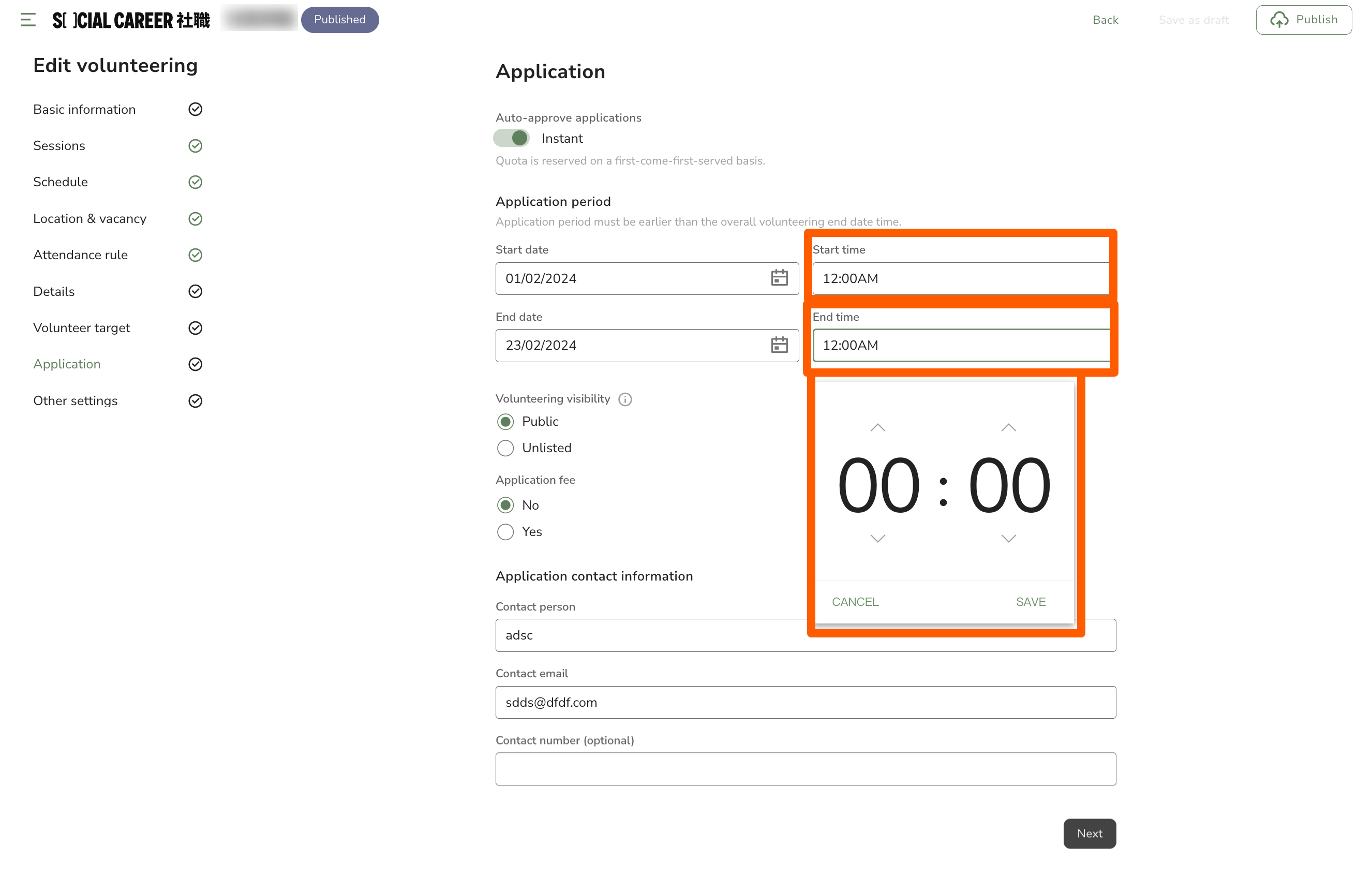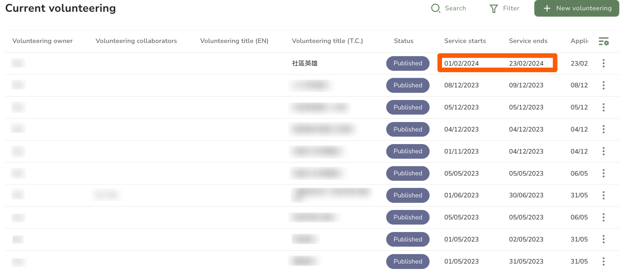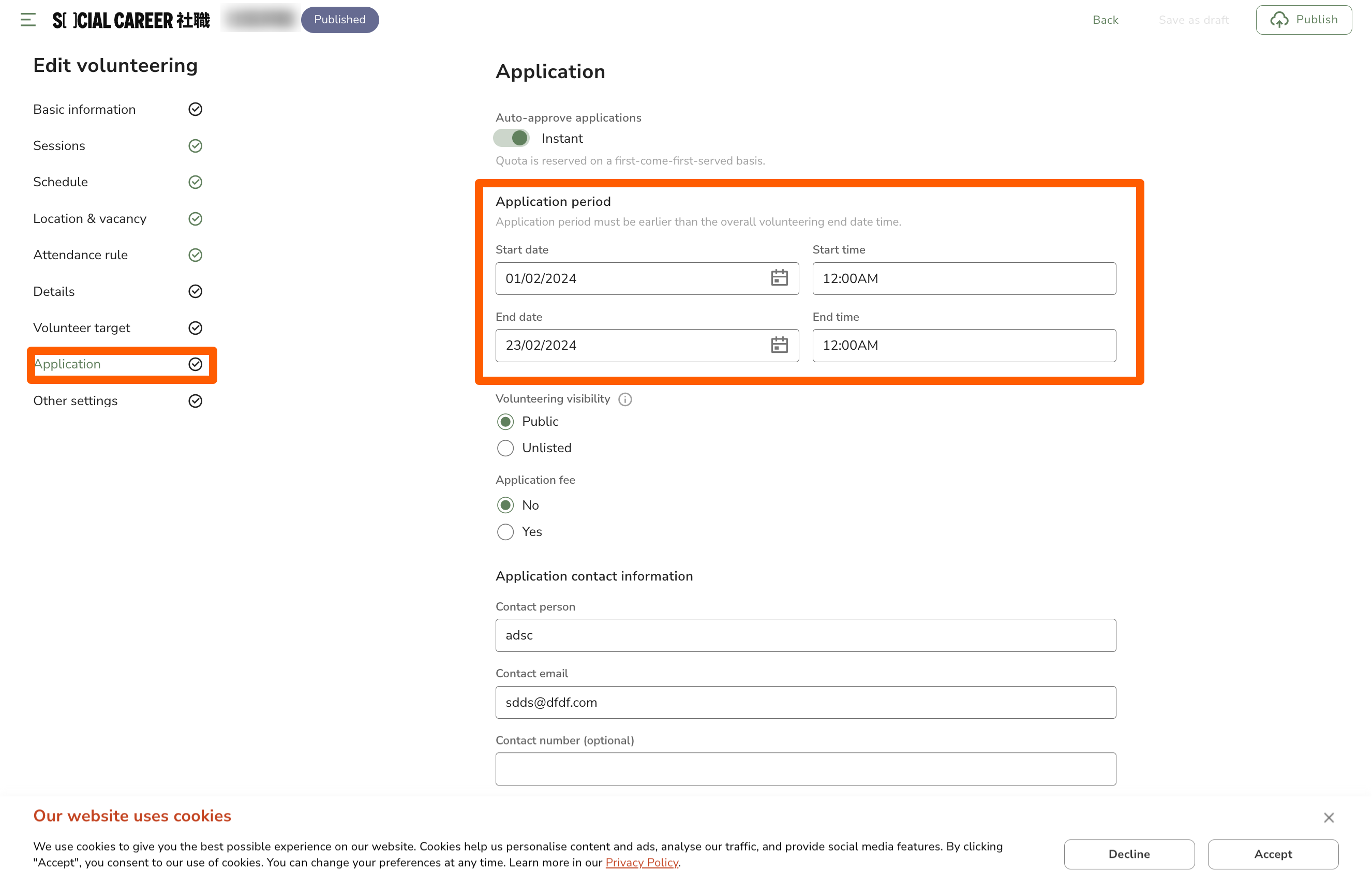 - You can use the following methods to change the application period and visibility of volunteer opportunities/events.