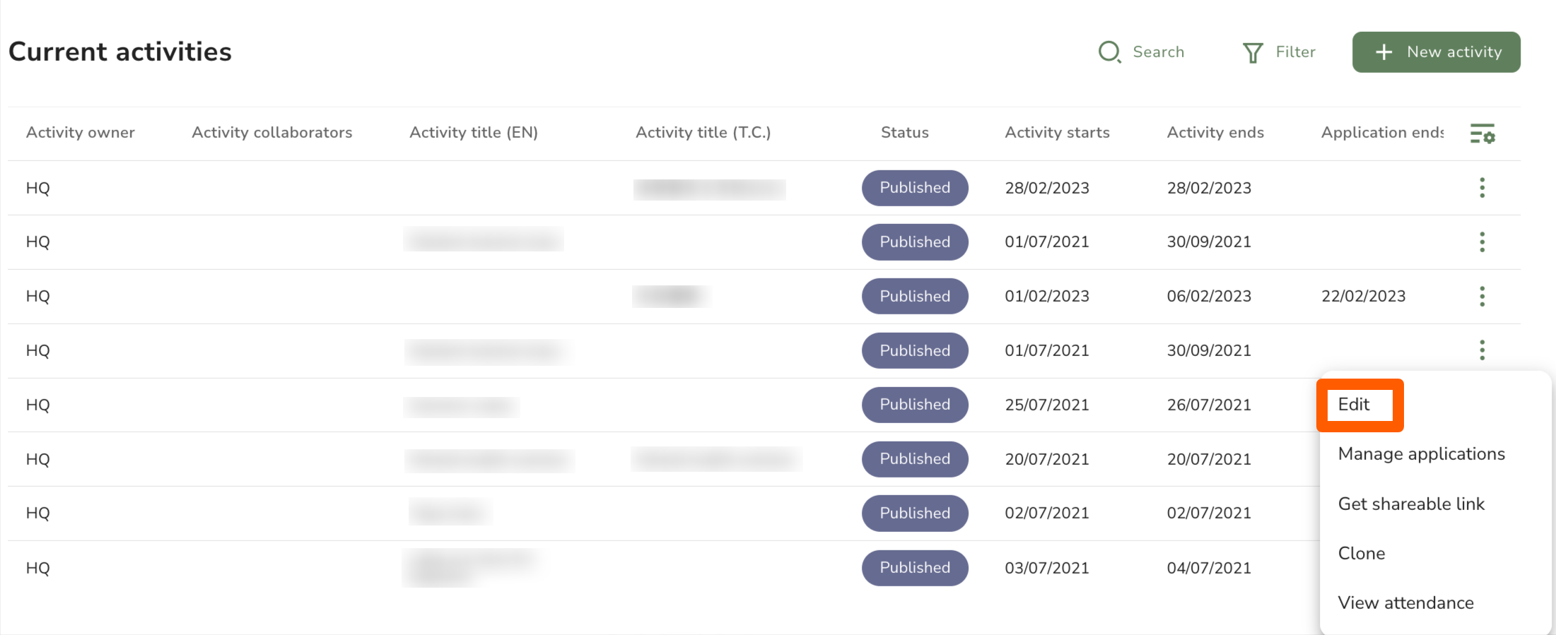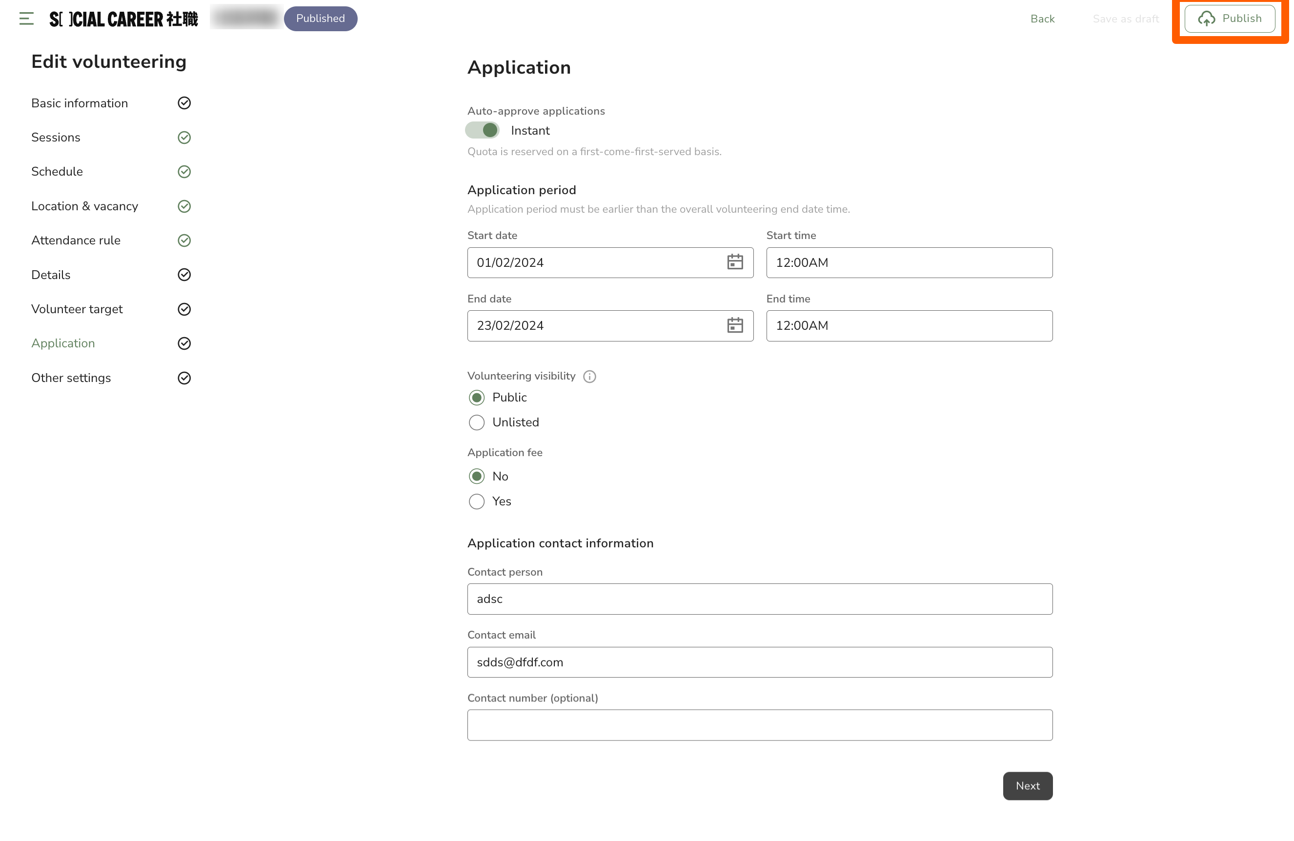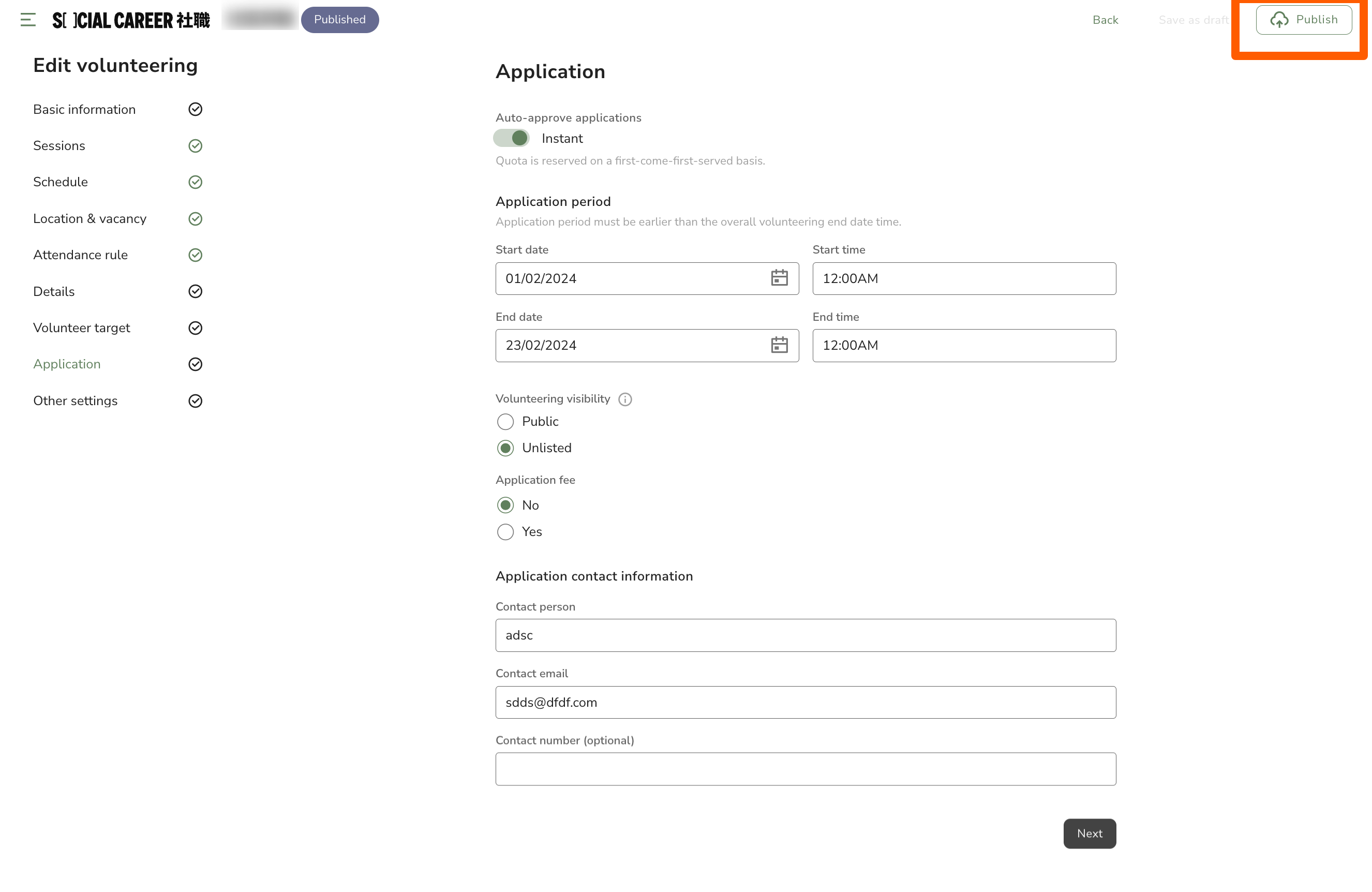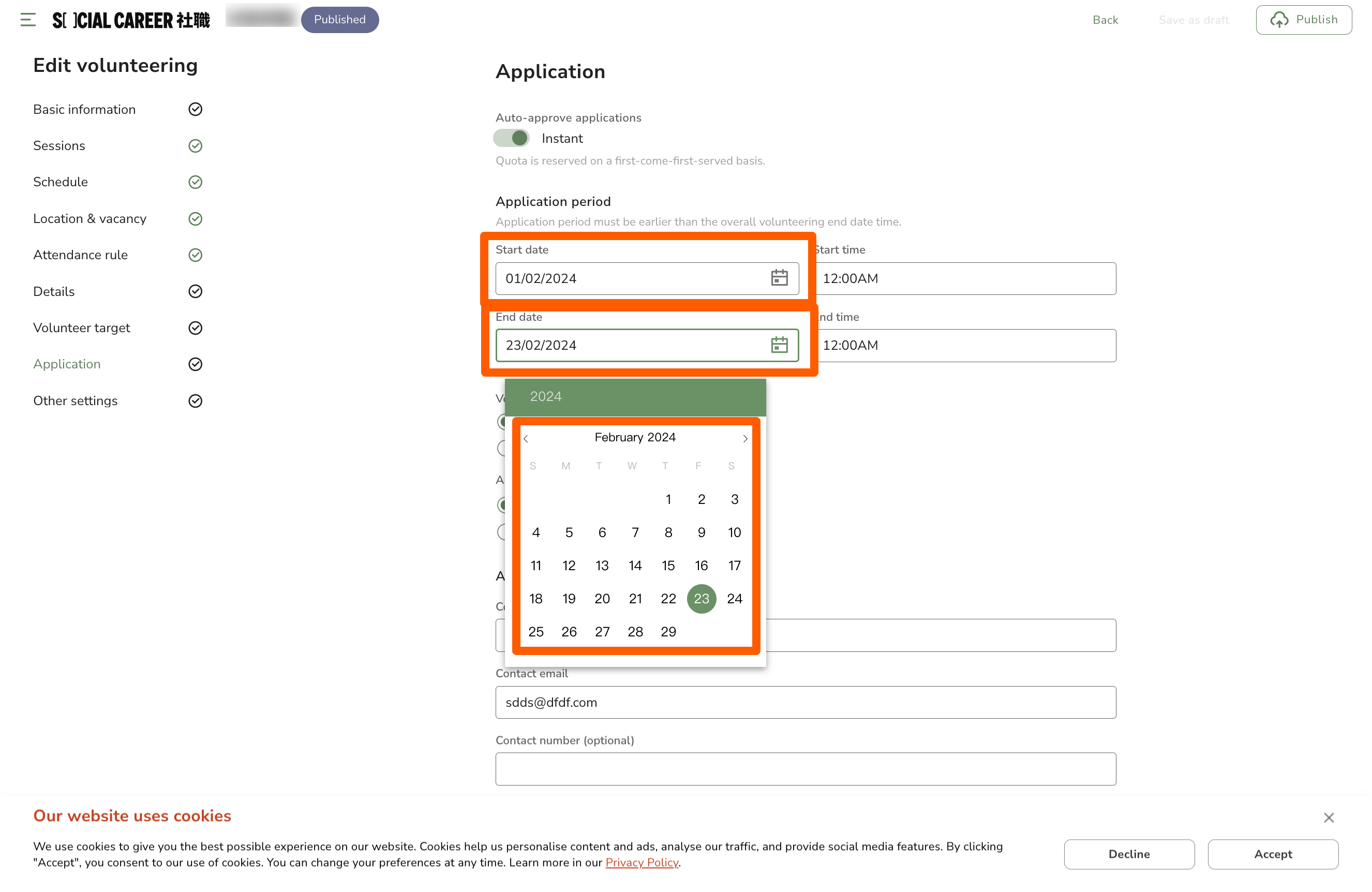 - You can use the following methods to change the application period and visibility of volunteer opportunities/events.