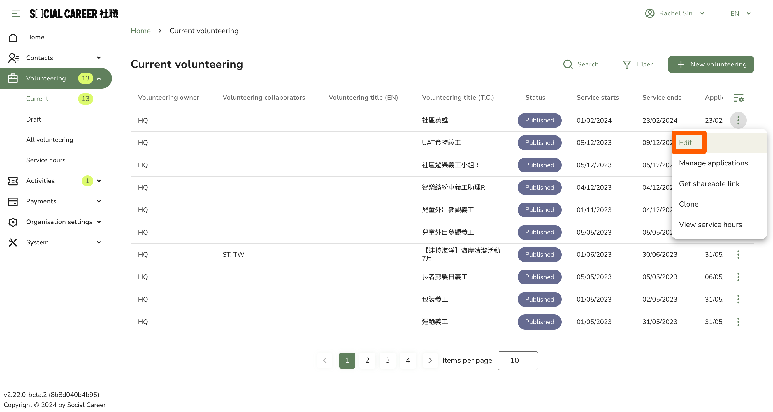 Note: This method only applies to volunteer opportunities/events that have not been previously shared. If you have already shared the link to the volunteer opportunity/event with specific participants for registration, then the participants can still apply this activity1. Select the "⋮" next to the volunteer opportunity/event you want to change, then choose "Edit".